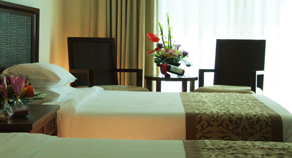 高級房,面積25平方米,樓層5-19層,有陽臺,大床(1.5*2米)雙床(1.2*1.8米),免費寬帶